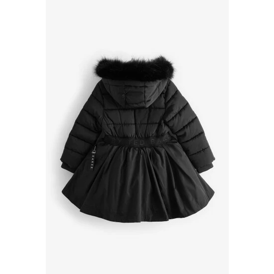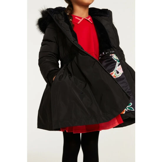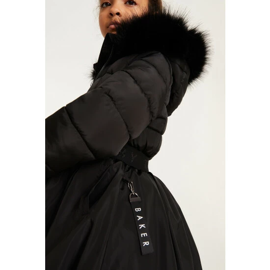This super stylish parka from Baker by Ted Baker is designed in a shower resistant fabric with our fabulous new skirted shape. Featuring a luxe detachable faux fur hood trim, tonal branded waistband, gunmetal branded zip and faux fur lined hood and body for extra warmth. Finished with our new season iconic internal Baker print.