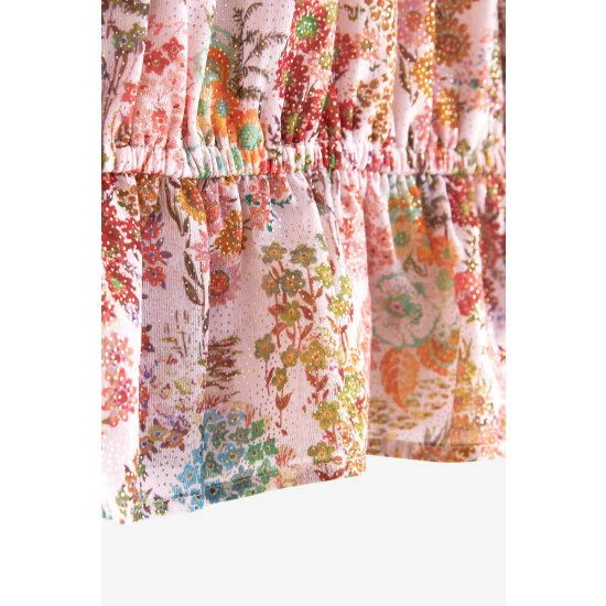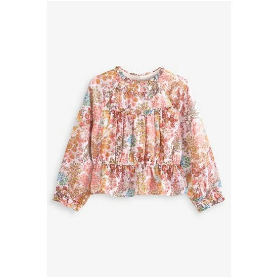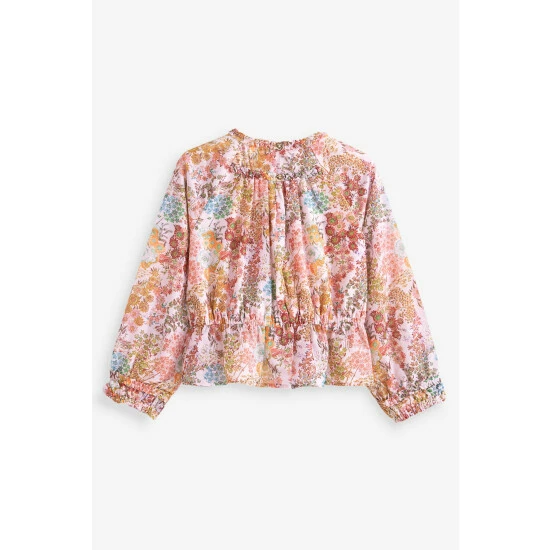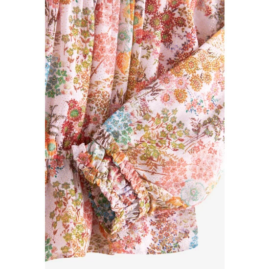 A pretty floral ditsy print blouse from Baker by Ted Baker. Made from a lightweight crinkle textured fabric, the print is beautifully dappled with gold highlights to catch the light. Pretty ruffle frills sit elegantly around the neckline and front yolk and the shape is pulled in with an elasticated peplum hem. Pretty Baker branded heart shaped buttons at the back add a playful finishing touch to this beautiful floral blouse.
