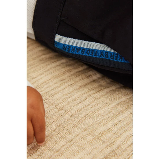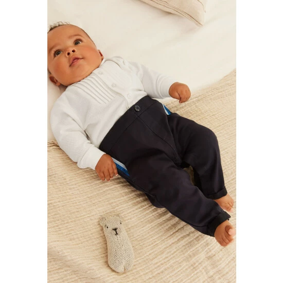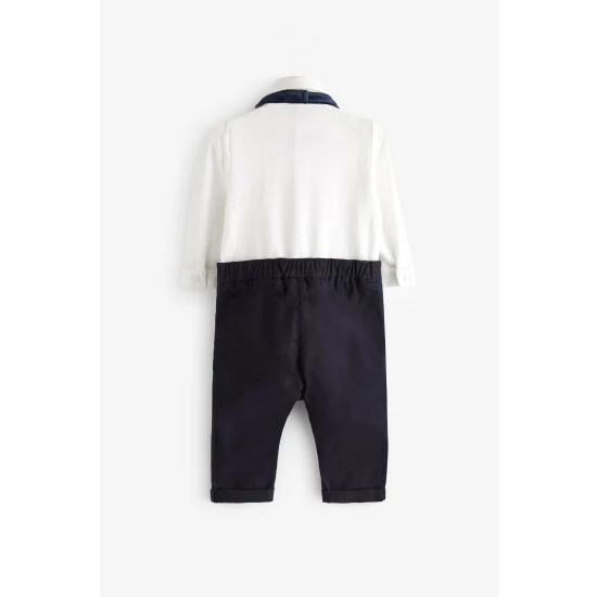 This adorable smart mock two piece has been designed with a cute shirt top with pintuck detail and bow tie. The navy trousers have flashes of Baker branded ribbon at the pockets to finish the look.