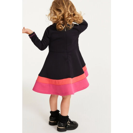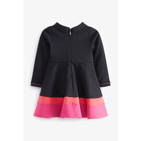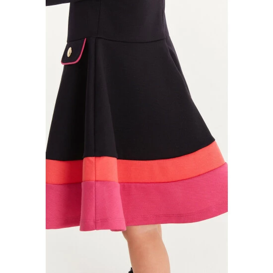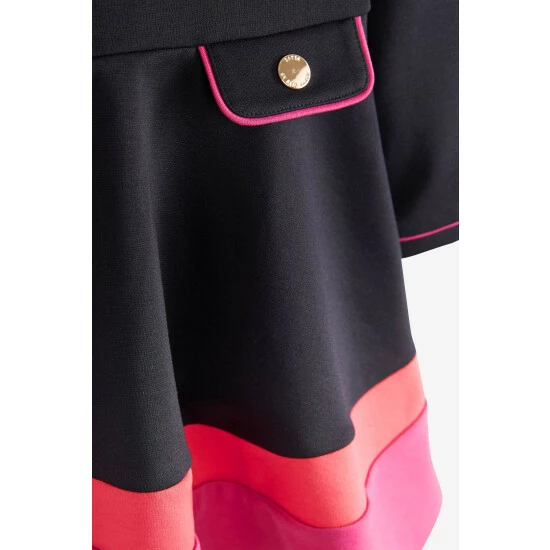 A gorgeous navy ponte dress from Baker by Ted Baker. Designed with a bold and bright colourblock hem, this pretty dress has faux pockets with gold branded buttons and a neat little collar with pink tipping. In a fit-and-flare style this dress has a concealed back zip.
