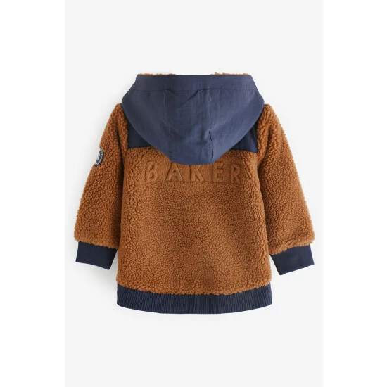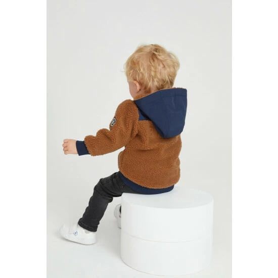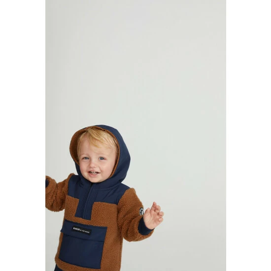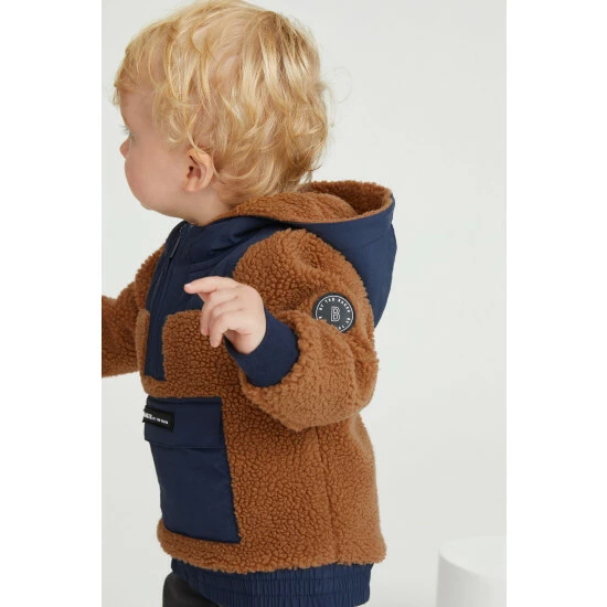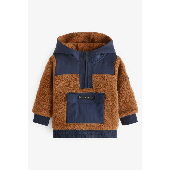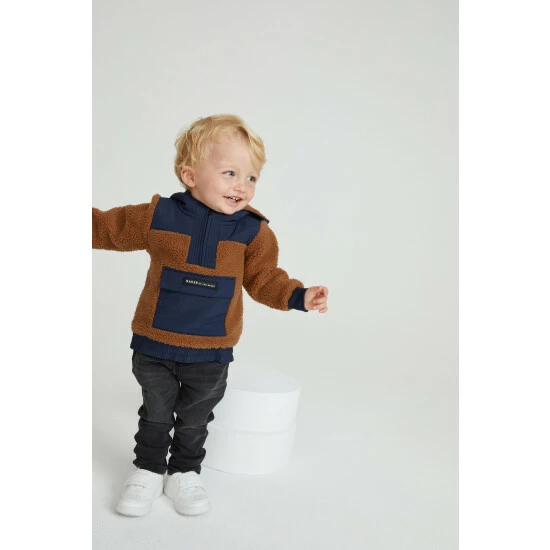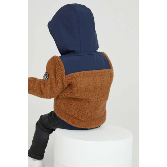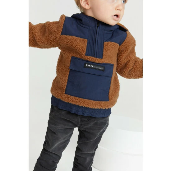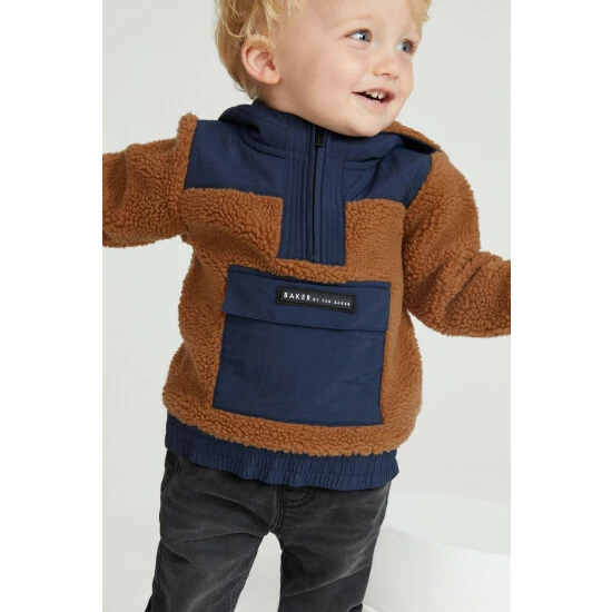 Keep your little man warm and stylish this winter with this adorable hoodie from Baker by Ted Baker. The snuggly brown borg overhead hoodie is complemented with navy panels on the chest and a navy branded pouch pocket on the front.