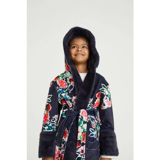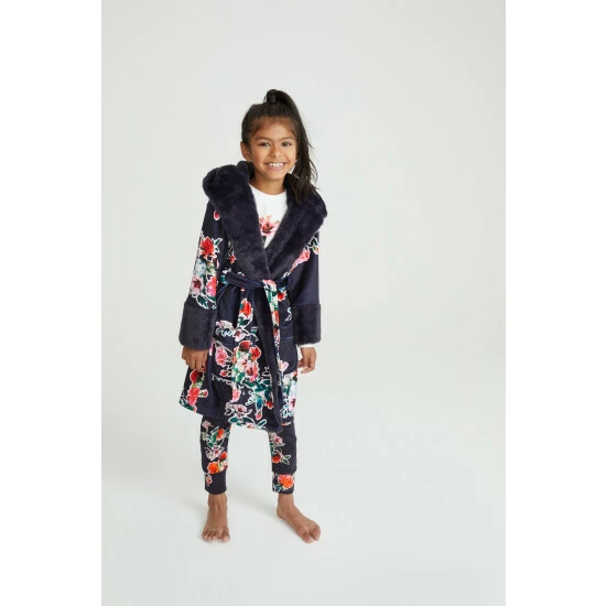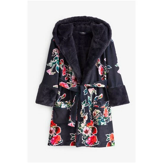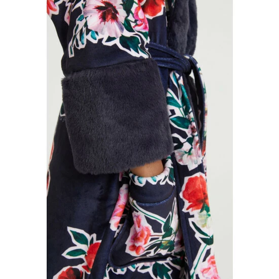 A gorgeously soft robe from Baker by Ted Baker, it features a pretty floral print on a navy blue base. The super comfy oversized hood and shawl collar are lined with a fluffy faux fur with cuffs to match for an extra special look.