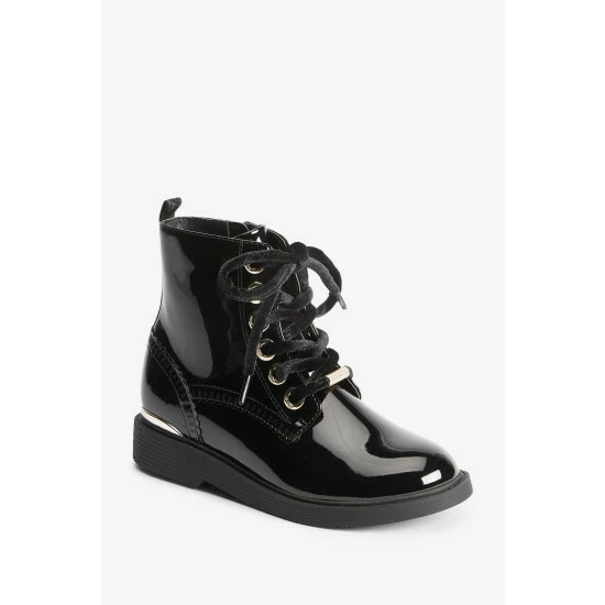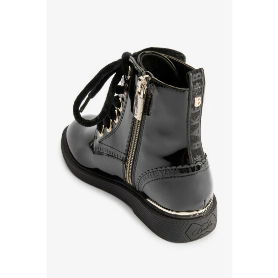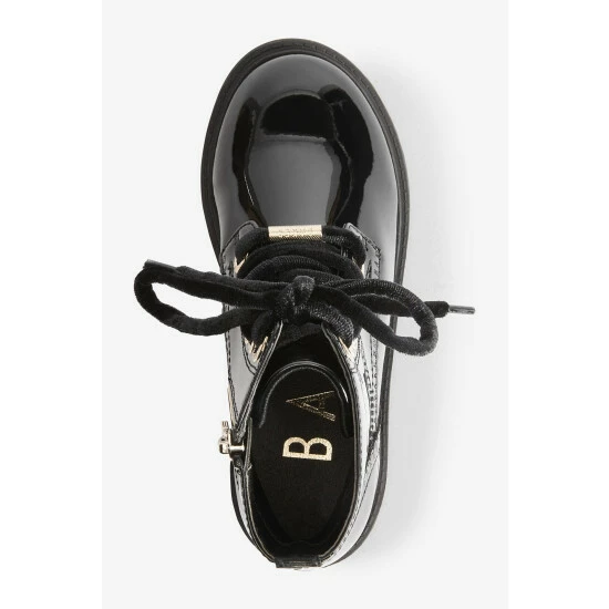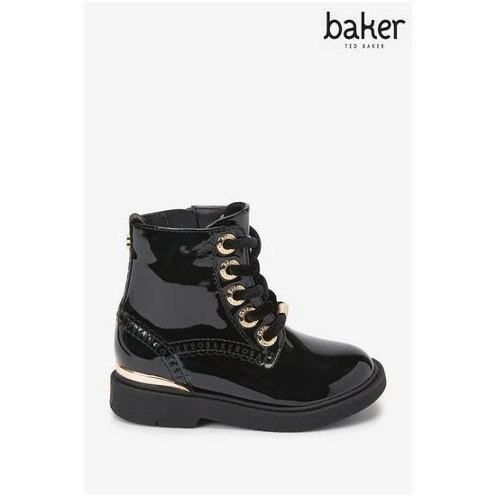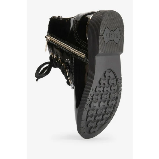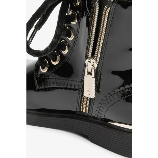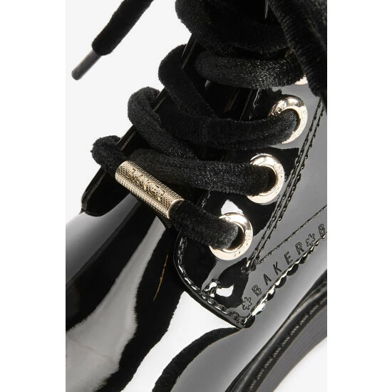 These black patent lace-up boots from Baker by Ted Baker have a side zip for easy dressing. Featuring gold metal hardware for a luxe look and branded zipper, eyelets and heel clip. Fashionable chunky and durable soles keep them comfy all day. With branded scallop brogue detailing and back tape. These wear on repeat favourites have gorgeous velvet laces for an elevated appearance.
