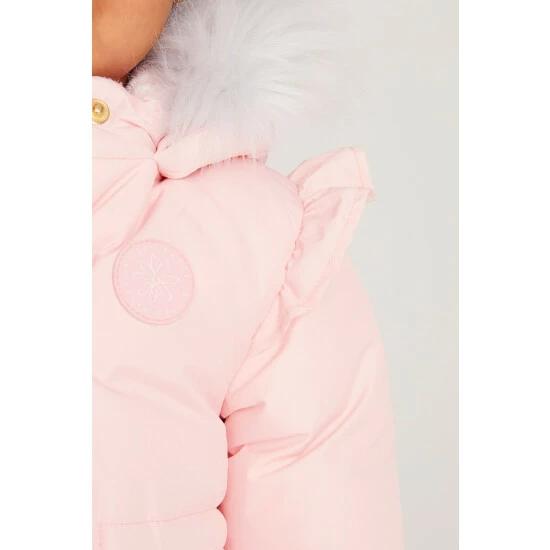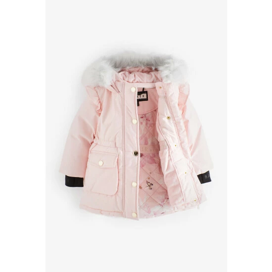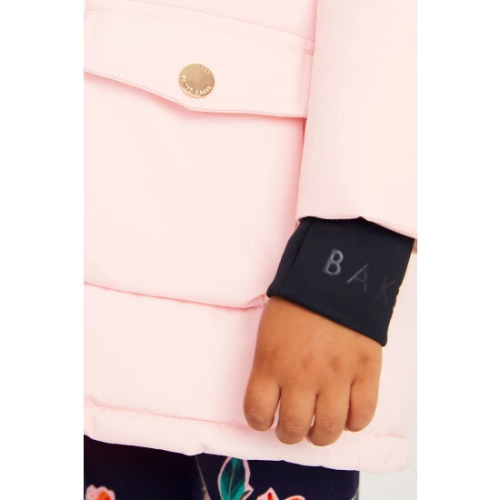 This lovely pink parka from Baker by Ted Baker is designed in a shower resistant fabric to help protect her from the elements. Featuring luxe detachable faux fur hood trim, branded neoprene cuffs with thumb holes for extra warmth, rubber branded chest badge, gold branded poppers and coated zip. With branded tape on hood for extra design detail, pretty print quilted lining, half faux fur lined for extra warmth, cosy fleece lined pockets and contains recycled wadding.