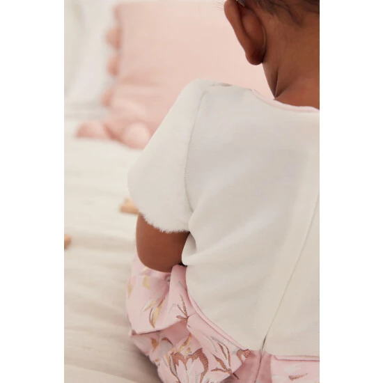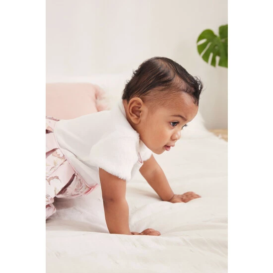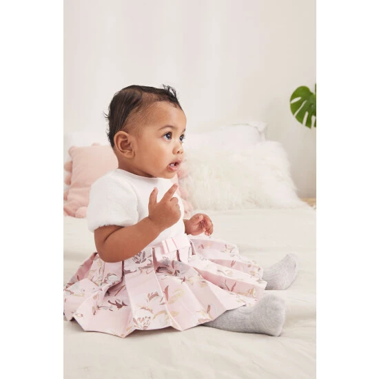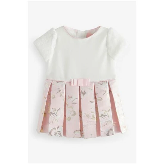 This stunning dress from Baker by Ted Baker is perfect for a special occasion. The top section has a crew neckline with pink edge detailing and soft faux fur short sleeves while the skirt is pleated with a gorgeous pink floral print and bow detail to the waistline.