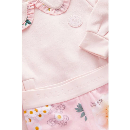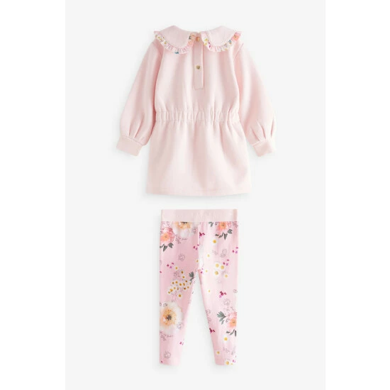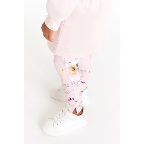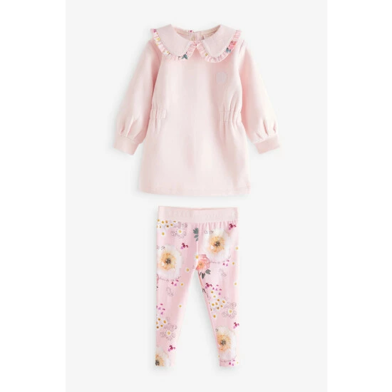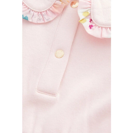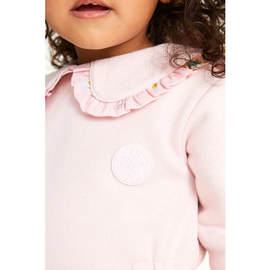This pretty longline pink sweatshirt features an adorable peter pan collar with contrast floral frill detail and an elasticated waist. Volume sleeves that are pleated at the cuffs add structure to the shape. Matching floral printed leggings with branded waistband complete the look. Featuring gold branded poppers at the front.