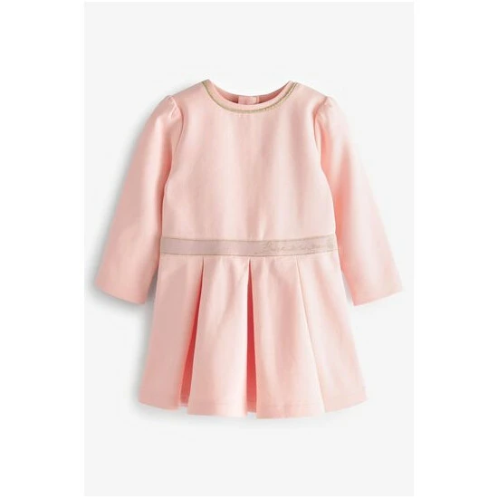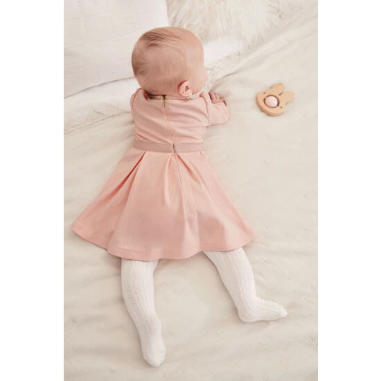 This beautiful baby girls' dress from Baker by Ted Baker is made in a soft cotton ponte fabric which adds structure and a comfortable stretch. The long sleeve style features a pleated skirt, shimmery gold trims with branding on the waistband and concealed zip fastening at the back.