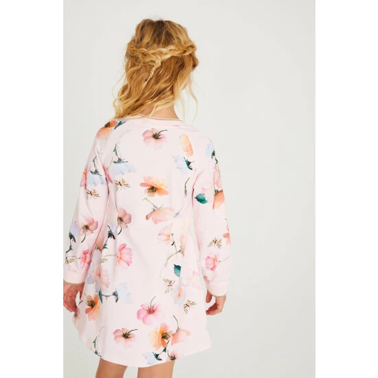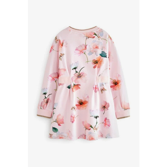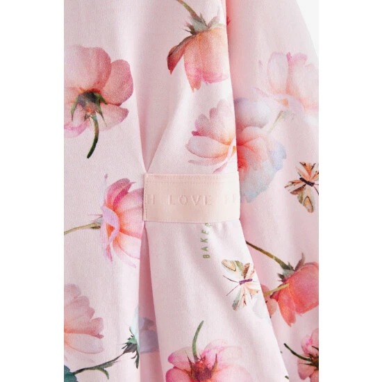 This gorgeous pink floral sweat dress from Baker by Ted Baker is made with a soft cotton jersey. Featuring a bright all-over print, it has raglan style long sleeves and a pretty waist ribbon detail at the sides. With shimmery gold edging on the cuffs and neck.