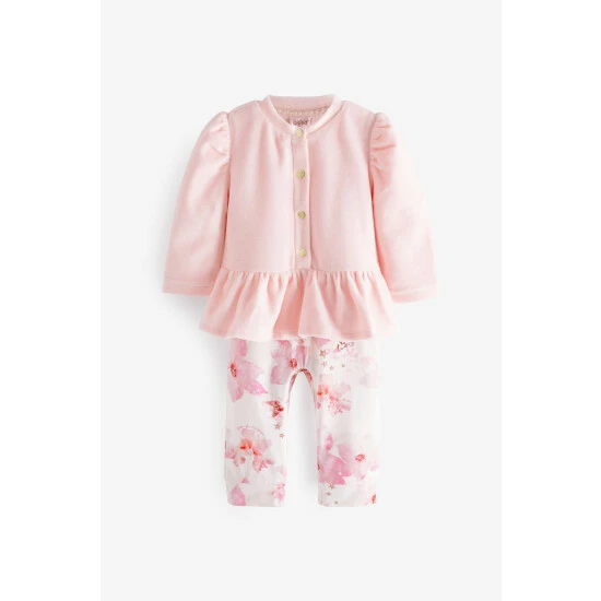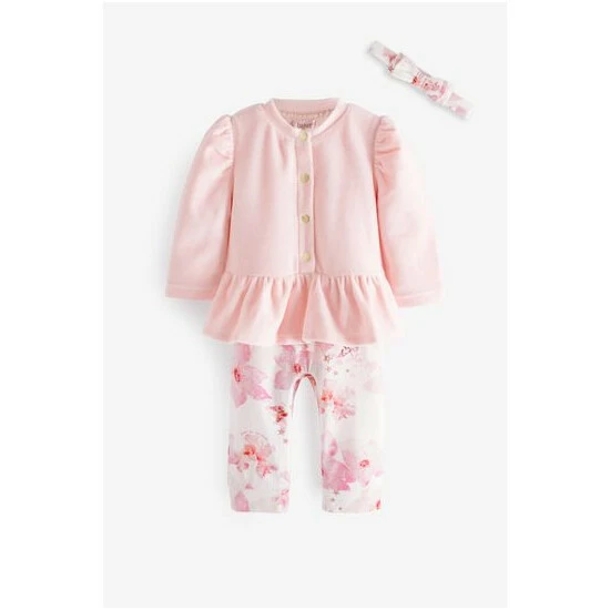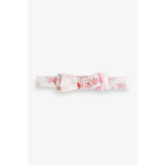 This gorgeous romper from Baker by Ted Baker is designed to look like a separate top and leggings. The top is made in a soft pink velour with gold hardware detailing and a pretty frill hem while the leggings are a gorgeous all-over floral and butterfly print. The look is finished with a matching print bow detail headband.