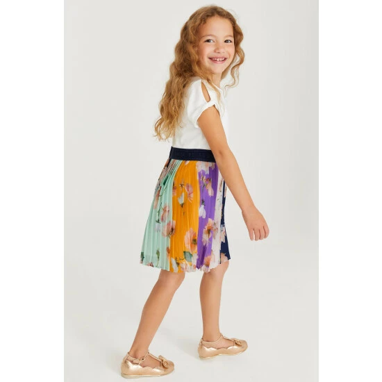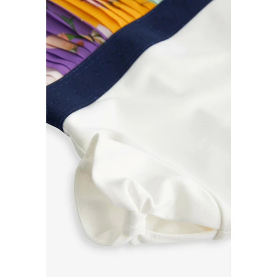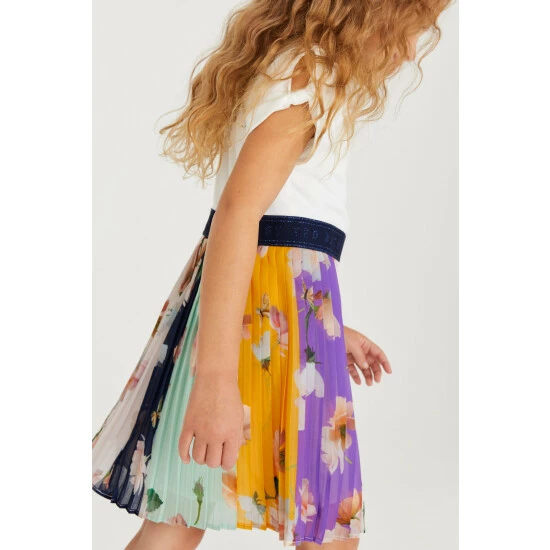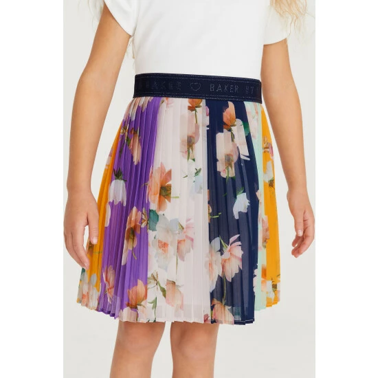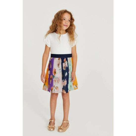 Enjoy dressing up your little lady in this adorable dress from Baker by Ted Baker. The mockable piece has a classic t-shirt top half with knot detailing on the sleeves and a hidden zip fastening at the back and is contrasted with a bold colourful pleated skirt. Perfect for parties, this charming outfit is finely finished with a shimmery branded waistband through the middle.