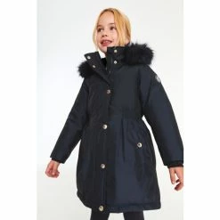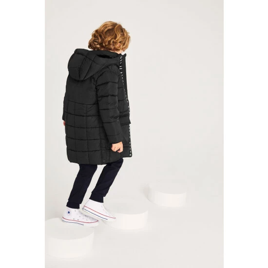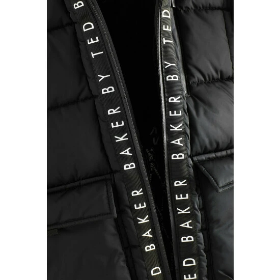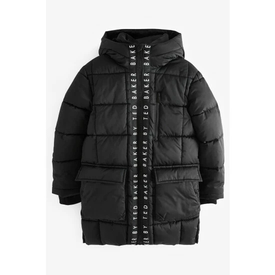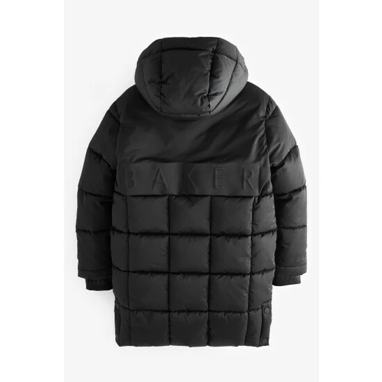 This long, black coat from Baker by Ted Baker is designed in a windproof, shower resistant fabric in a heavyweight style. Cut in a longline silhouette with cosy fleece lined pockets, storm cuffs, printed lining and Baker branding down the front and on the back.
